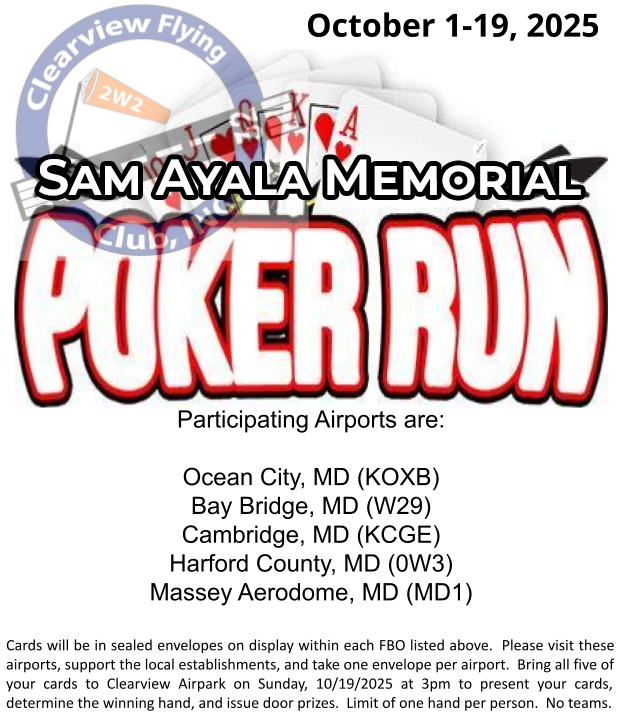 Participants will fly (not drive) to each of designated airports or airstrips anytime between October 1st through October 19th, collecting a sealed envelope containing one playing card at each stop (please keep the envelope sealed until at the final event on October 19th at Clearview Airpark). After visiting all of the participating airports, participants will be in attendance on October 19th at 3PM for the Clearview Flying Club’s monthly meeting, hosted at Clearview Airport, where the last two cards of the Reverse Texas Hold ‘Em will be revealed, and the winners determined